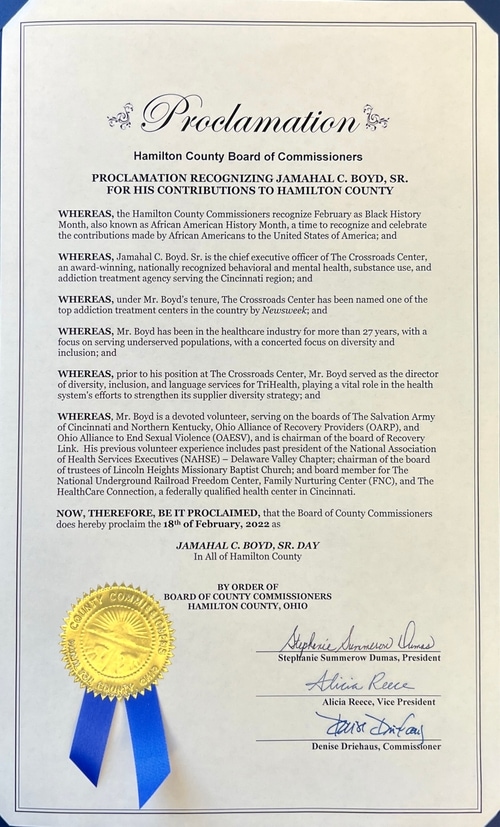 In recognition of his long-time service in healthcare, Diversity, Equity, Inclusion and towards fighting addiction and supporting behavioral health services, The Hamilton County Board of Commissioners have designated February 18th as “Jamahal C. Boyd Sr. Day" in Hamilton County!